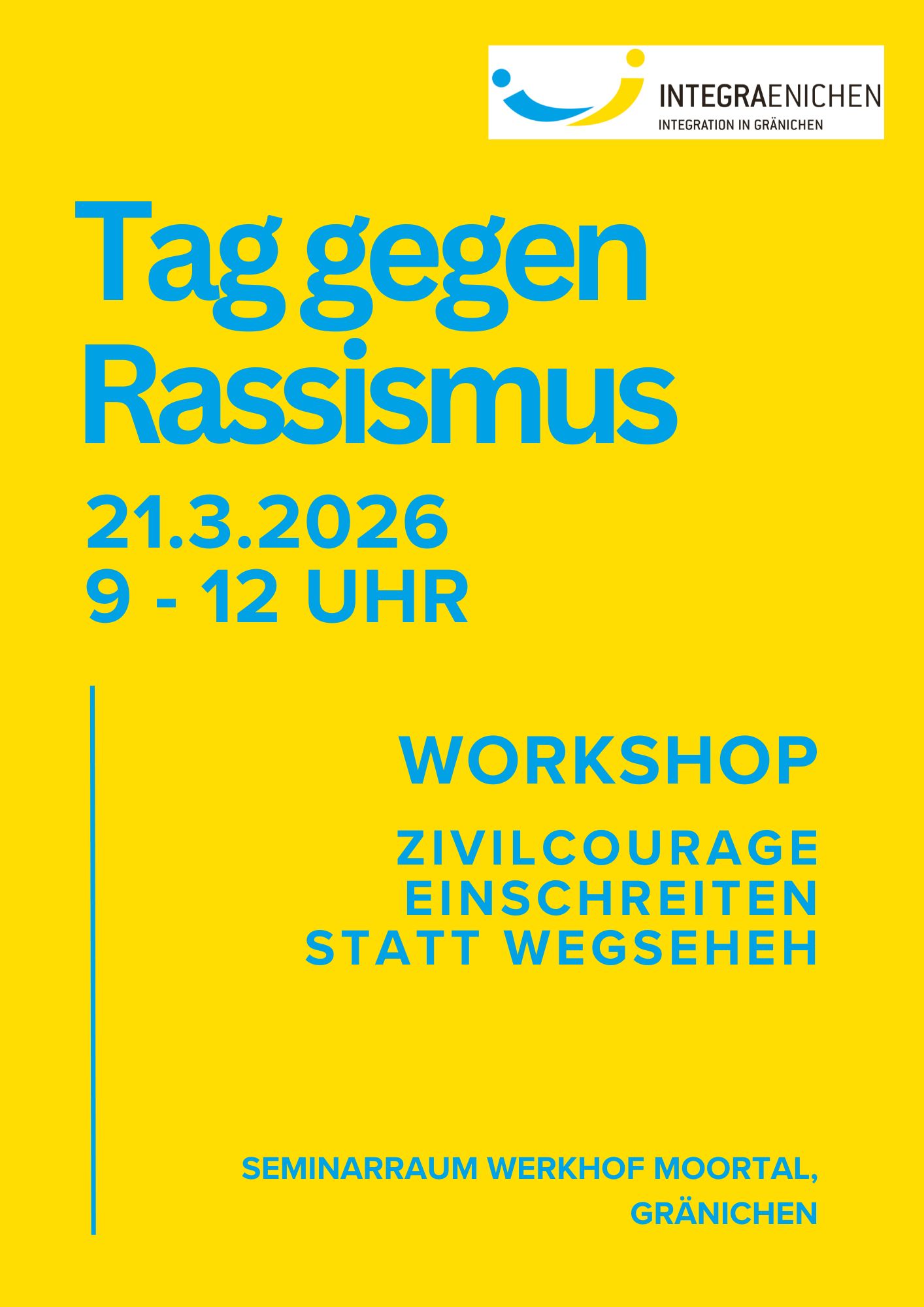 Der Verein Integraenichen organisiert auch dieses Jahr am Tag gegen Rassismus einen tollen Workshop zum Thema Zivilcourage. Der Workshop hat eine begrenzte Platzanzahl. Wir bitten darum um eine Anmeldung. Da unser verein das 10 jährige Jubiläum feiert, offerieren wir den Workshop allen Interessierten.